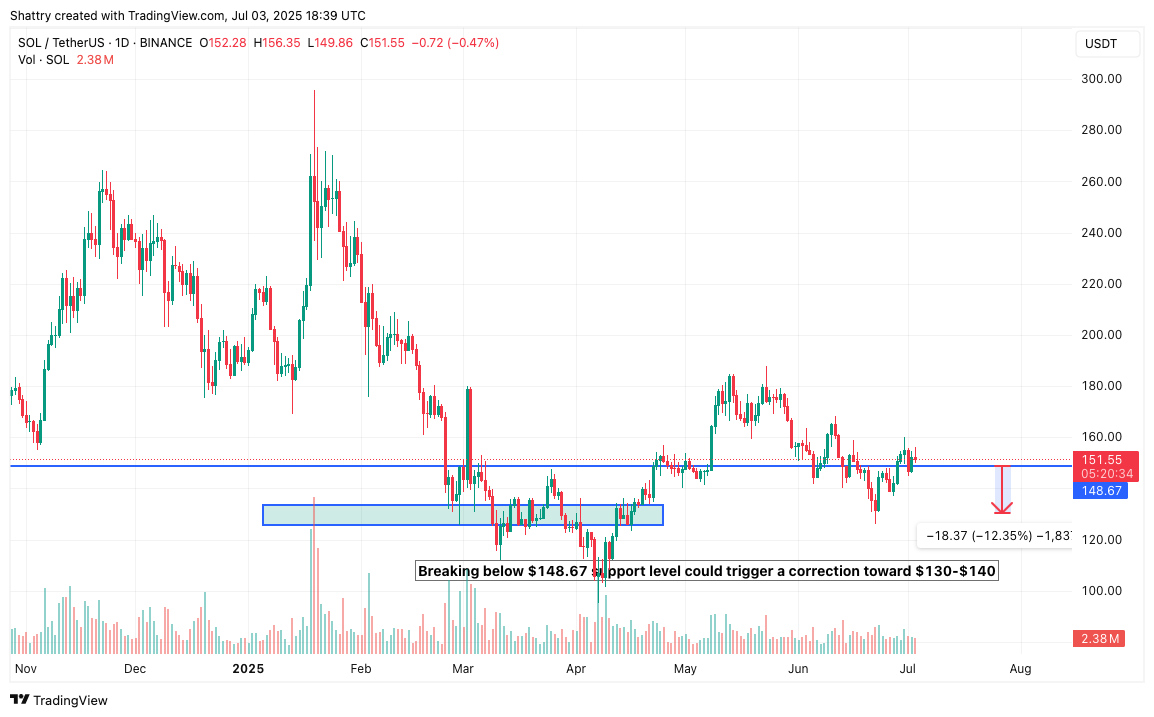Support at the 20-day EMA around $148.67 would likely hold during consolidation, with volume normalizing around 2–3 million SOL daily. This sideways action provides accumulation opportunities without substantial downside risk.