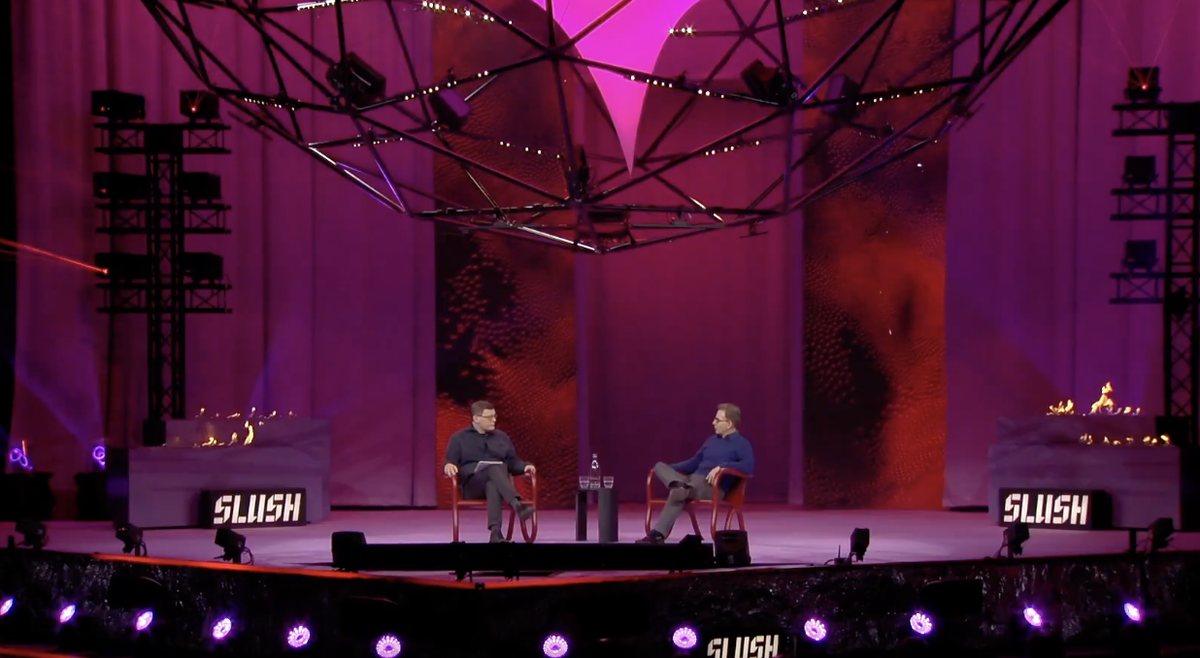 John Thornhill, left, speaking with Mark Thompson at Slush 2025 in Finland. Source: PsiQuantum