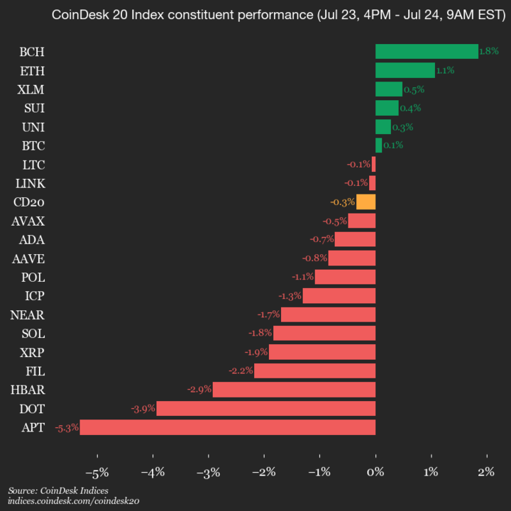 Leaders: BCH (+1.8%) and ETH (+1.1%).