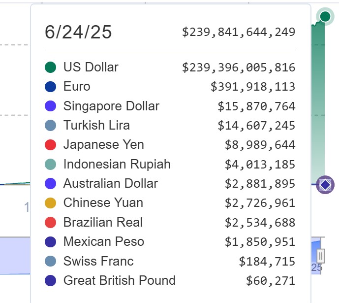Stablecoins are a $239 billion market, according to industry data. However, 99% of that value is tied to the US dollar.