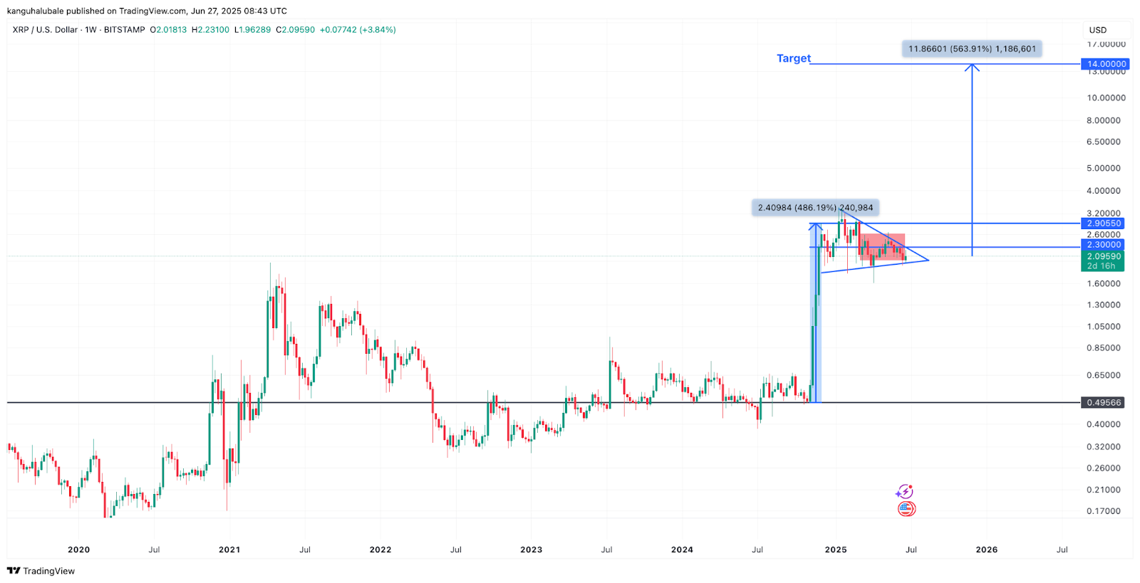 A positive breakout from the pennant could potentially lead to the next leg up for XRP, measured at $14, or 564% from its current price level.
