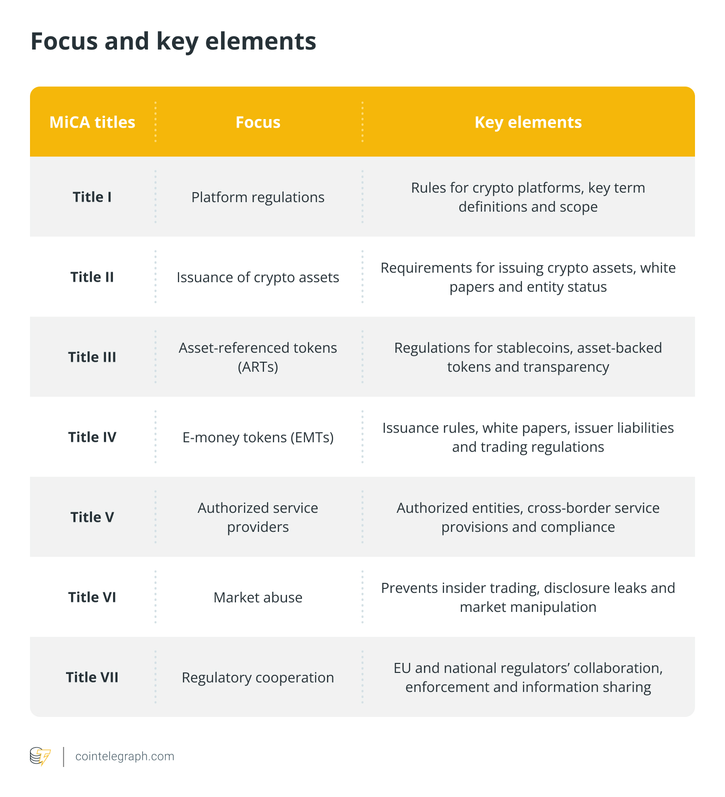 The MiCA package was an exhaustive regulatory effort from the EU that took four years from its inception until it came into force. Its seven titles contain laws and rules for platform regulations, token issuance, market abuse and more.
