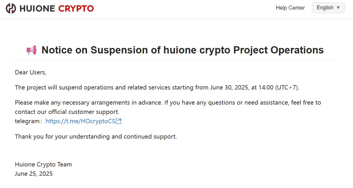 Huione-branded super-exchange.co announces wind down of crypto project. Source: Huione Crypto