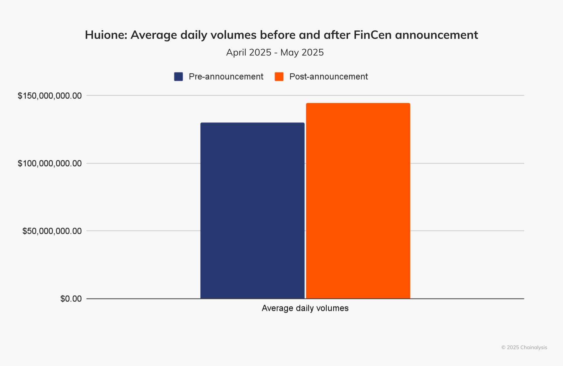 Chainalysis observes an increase in Huione-linked transactions after the FinCEN designation. Source: Chainalysis