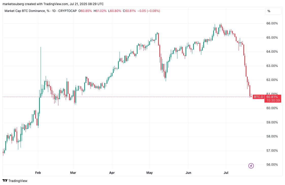 After hitting 66%, dominance has collapsed over the past week, now targeting the 60% mark for a support retest — its lowest levels since the start of March.
