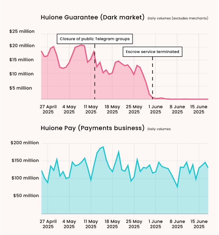 “By analyzing blockchain transactions at a more granular level, it is clear that, although Huione Pay continues to transact high volumes, Huione Guarantee’s transactions have effectively ceased,” Elliptic said.