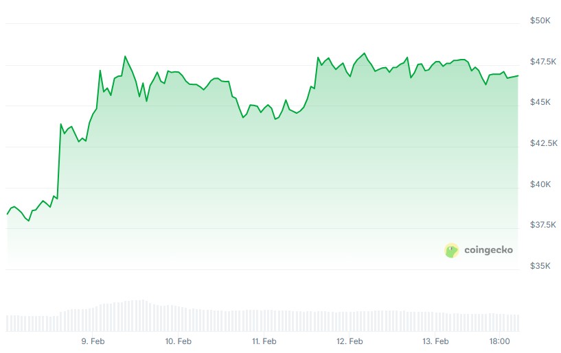 How Bitcoin’s price reacted to Tesla’s purchase on Feb. 8, 2021. Source: CoinGecko
