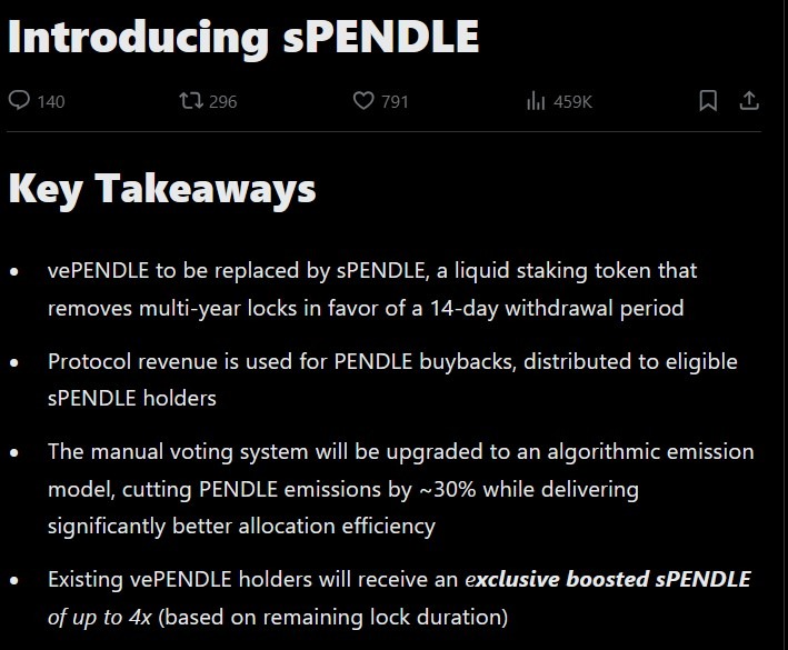 The team said vePENDLE’s long lock-up periods, lack of transferability and complex voting mechanics limited participation, even as the protocol grew to nearly $3.5 billion in total value locked (TVL).