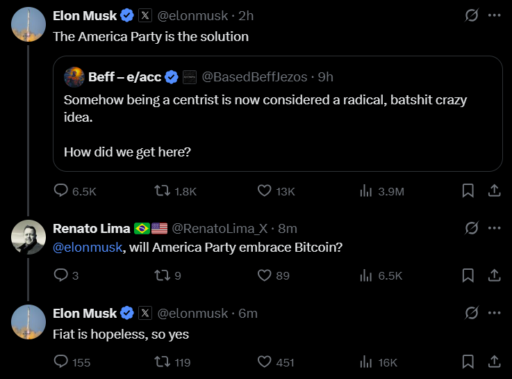 Musk made the statement in response to a user’s question on X about whether the ‘America Party’ would embrace Bitcoin. He showed agreement and expressed skepticism toward the fiat currency.