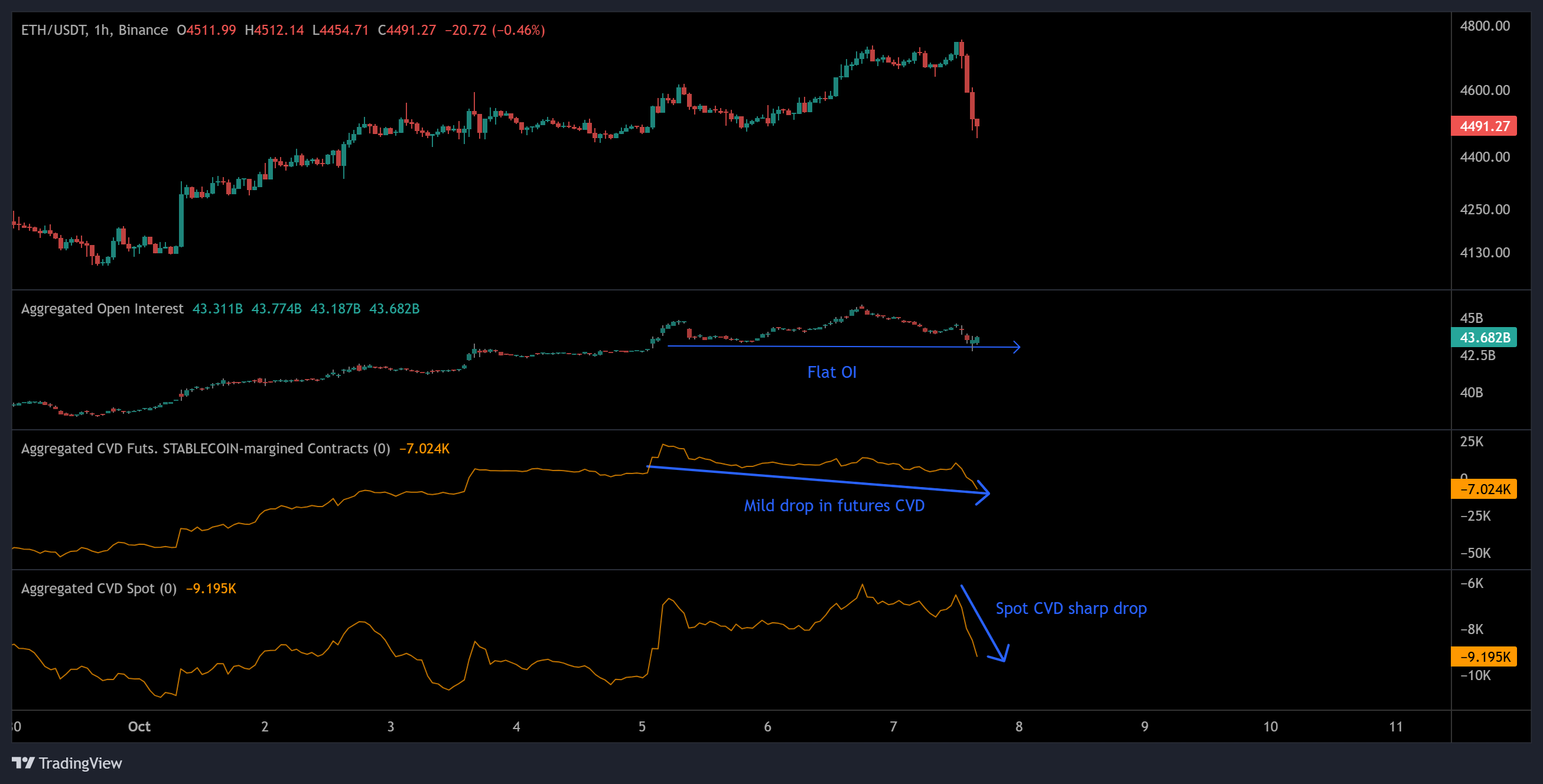 ETH retested the $4,500 level, with onchain and derivatives data showing mixed signals. While spot cumulative volume delta (CVD) has dropped sharply, indicating net selling pressure in the spot market, futures open interest and futures CVD have remained elevated. This suggested that leveraged traders are still active and positioning for volatility, even as spot buyers take profits.