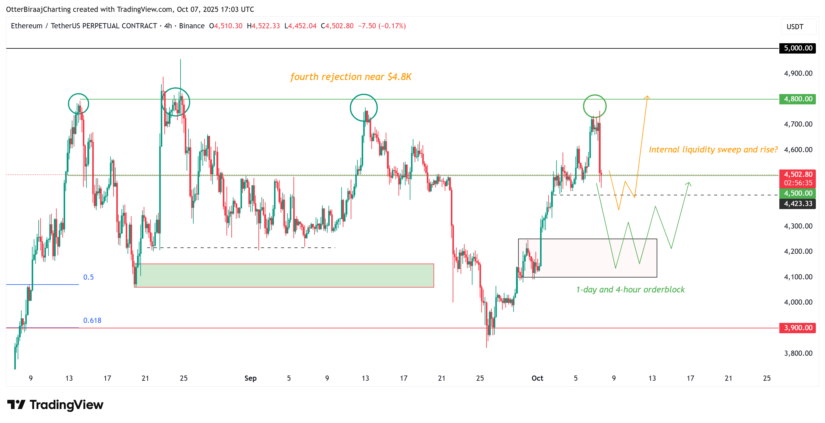 On Monday, as Bitcoin (BTC) rallied to a new all-time high, Ether (ETH) failed to clear its resistance at $4,800, triggering a sharp 3% correction below $4,500 on Tuesday. The price dip took place on the back of a bearish divergence on the four-hour chart. This typically indicates that buyers are losing strength, often preceding a local top or short-term reversal.