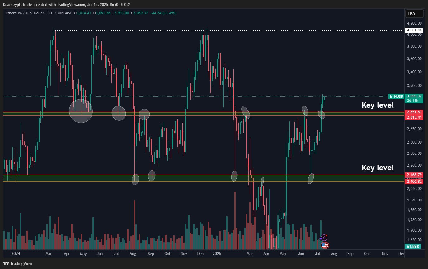 Adopting a more technical approach, analyst Daan Crypto said that the immediate target for ETH remains $4,000 after it entered the upper half of an 18-month cycle range. In an X post, the trader mentioned,