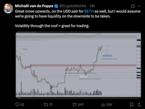 Some traders, including independent market analyst Michael Van de Poppe, believe that “liquidity on the longside [is] ready to be taken,” suggesting a brief retrace to the $3,500 to $3,300 zone will occur before a rally through the $4,000 resistance.