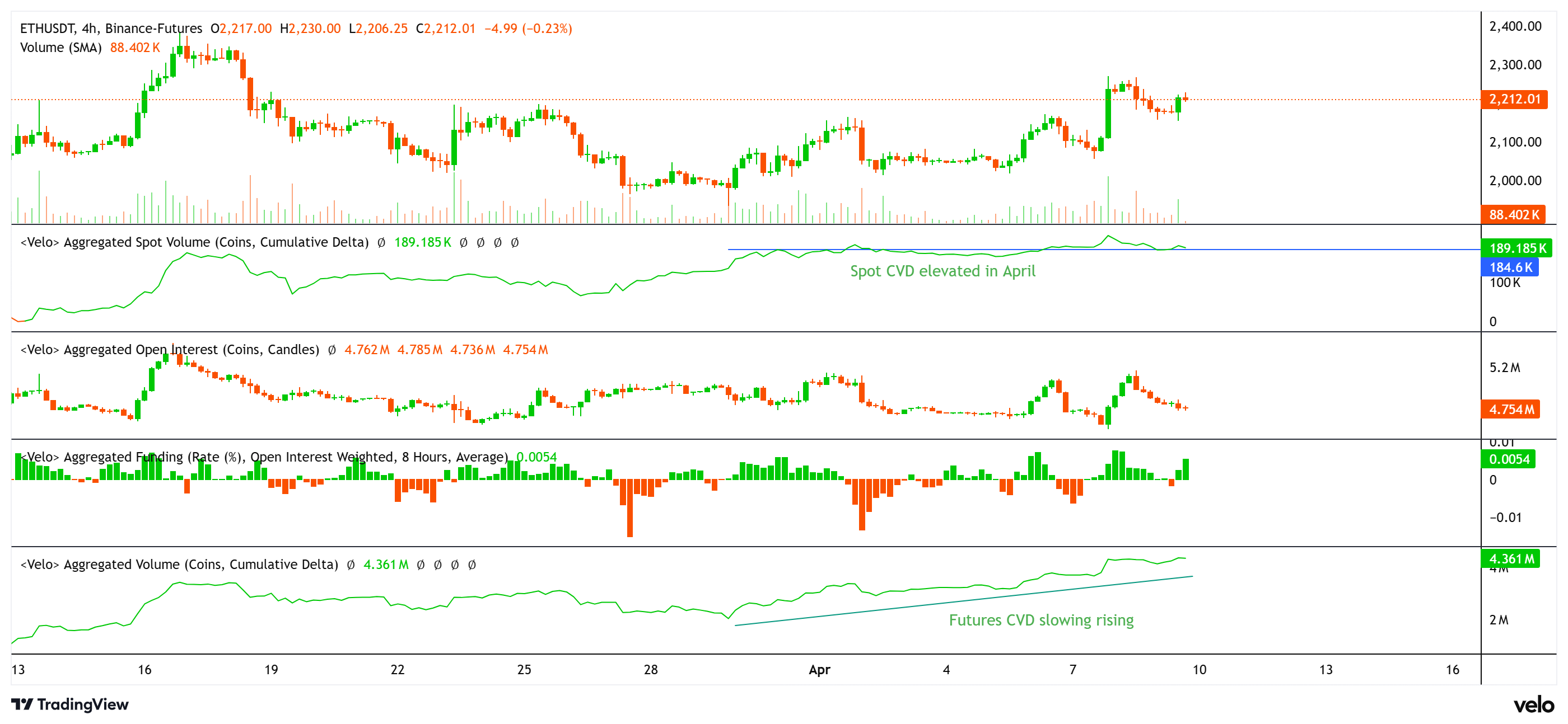 The aggregated spot cumulative volume delta (CVD) has remained elevated in April at 184,500 ETH, reflecting sustained spot demand.