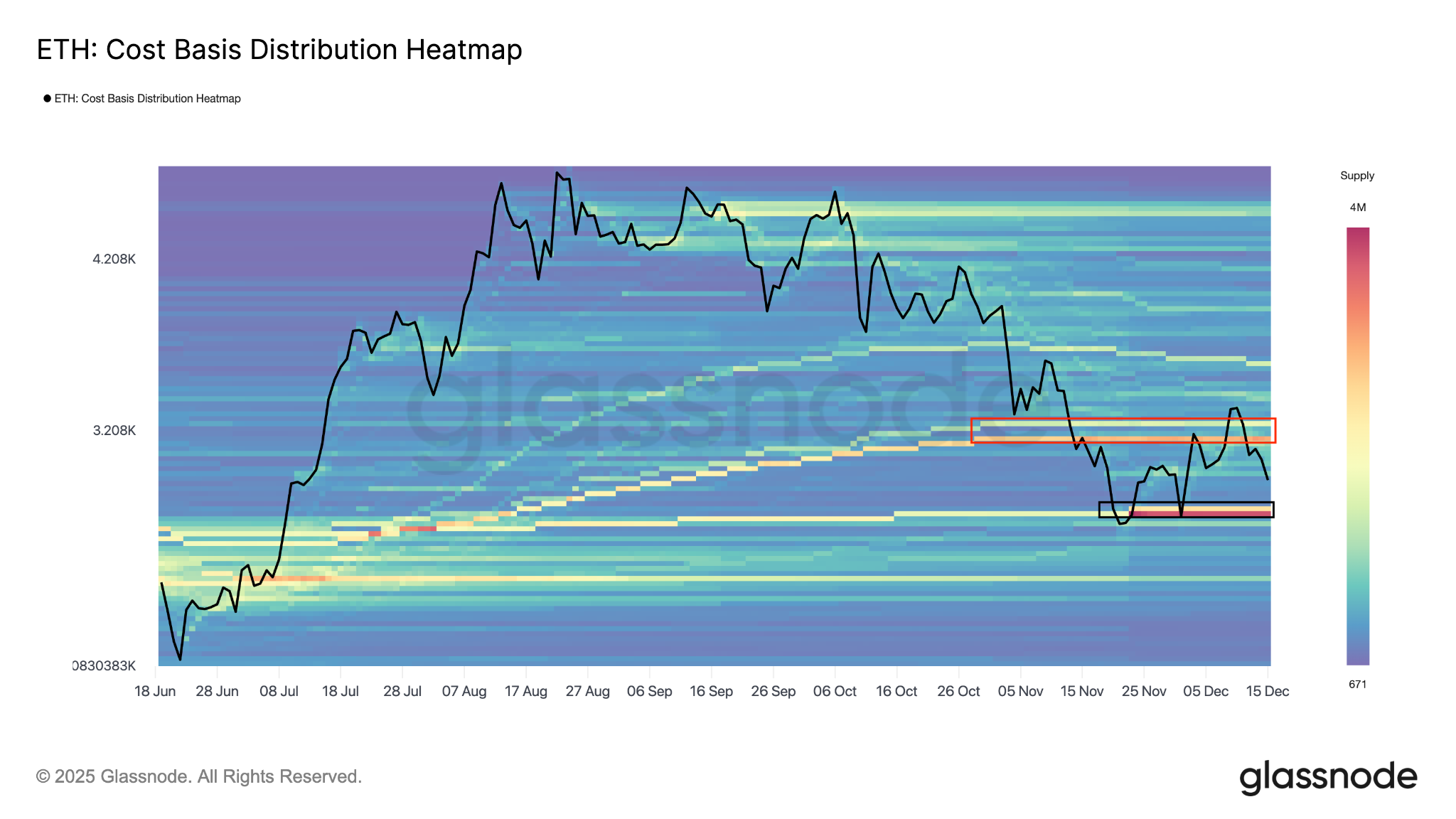 The Glassnode cost basis distribution heatmap showed resistance between $3,100 and $3,250, where investors acquired roughly 5.9 million ETH.