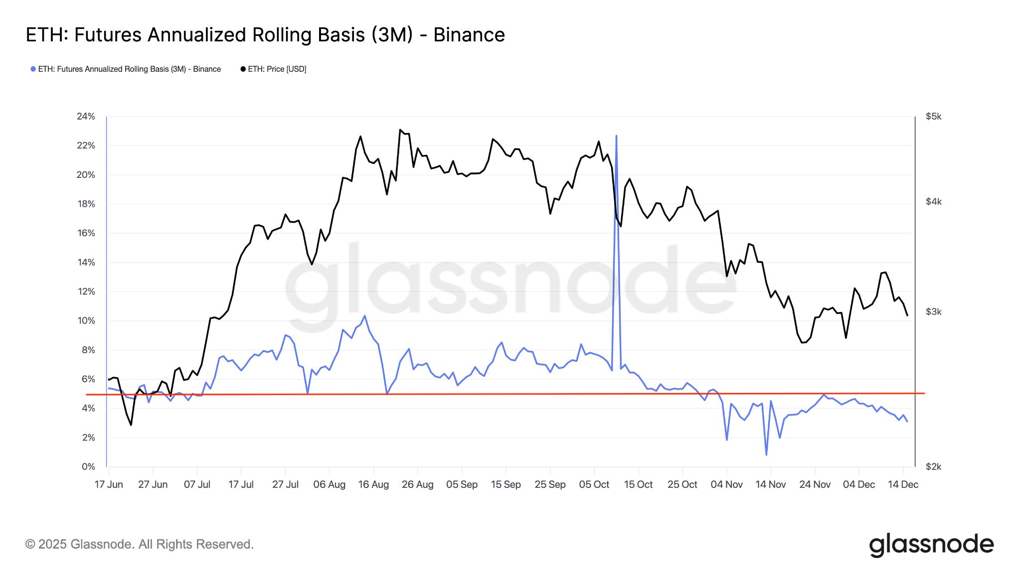 Ether futures are currently trading at a 3% premium relative to bearish ETH spot markets, reflecting declining demand from buyers using leverage.