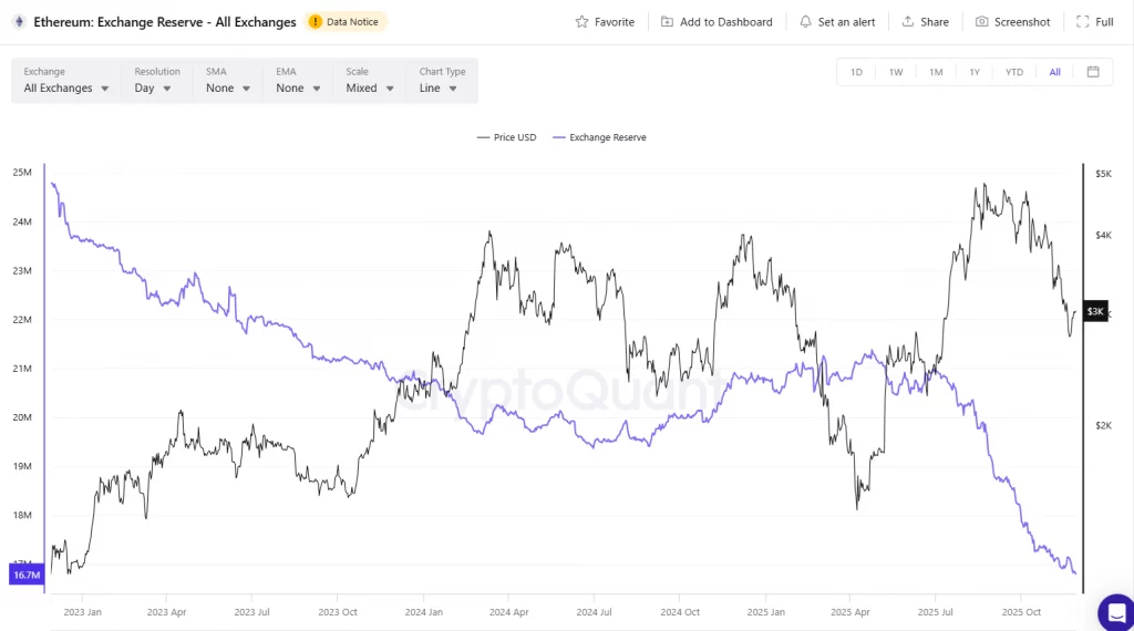 ETH reserves on exchanges sit at an all-time low, signaling almost no readiness for spot selling. ETH relies on derivative trading, which has accelerated in recent days.