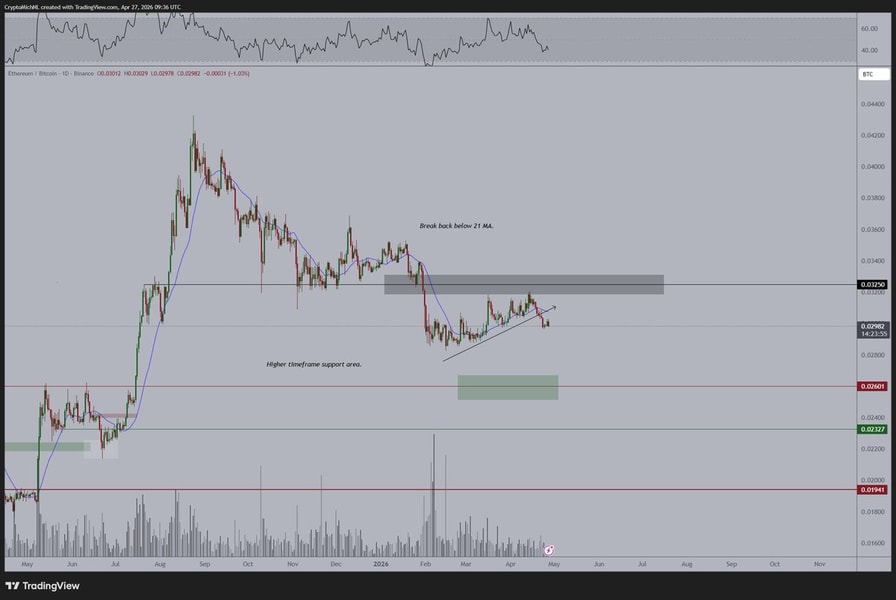 MN Capital founder Michaël van de Poppe noted weakness in the ETH/BTC pair. The ratio dropped below 0.032 BTC, removing a key support level tied to prior continuation attempts.