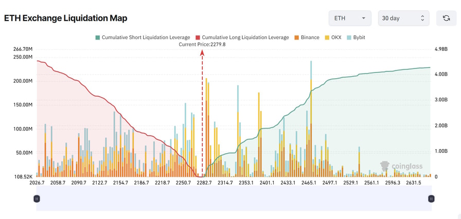 Ether (ETH) fell 3.4% to $2,287 on Monday, after its fourth rejection at the $2,400 level since April 14. The price continues to trade below the 100-day moving average, with over $2.5 billion in liquidation risk concentrated near the $2,150 support zone.
