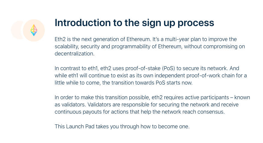 We start with the basics. Before you even begin the sign-up process, you should understand what eth2 is, and why validators are necessary for eth2 to work properly.