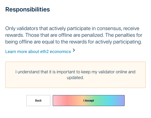 With respect to responsibility, we want to make sure you understand that you will only receive rewards if you actively participate in consensus, and that this process is non-reversible (you won’t be able to transfer your staked ETH out of eth2 until much later).