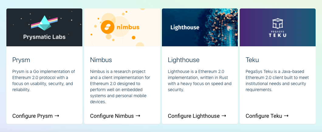 Now that you’ve made your deposit, the next step is to choose your client (the software you’ll use to set up your Beacon Node, import your keystores, and run your Validator).