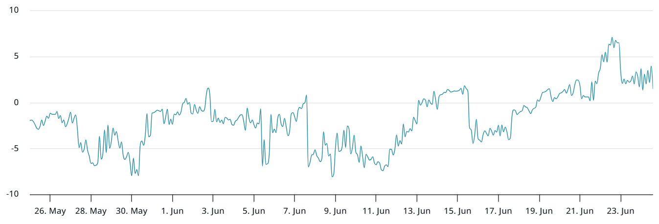 Currently, the 2% skew falls well within the neutral zone, although it briefly approached bearish territory on Sunday. More notably, ETH options haven’t shown a skew below -5% since June 11, implying that traders expect a consolidation above $2,800 to trigger a bullish shift.