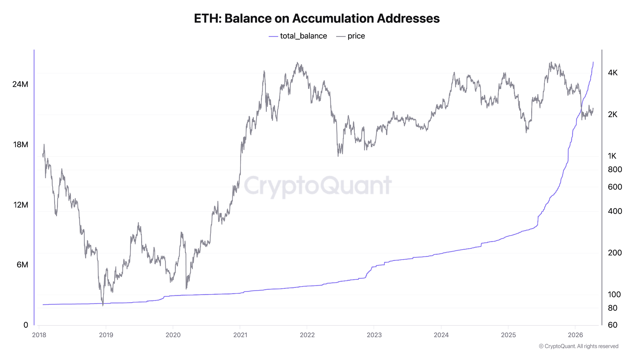 Data from CryptoQuant shows that ETH accumulation began in late 2025 and has proceeded more aggressively throughout 2026.