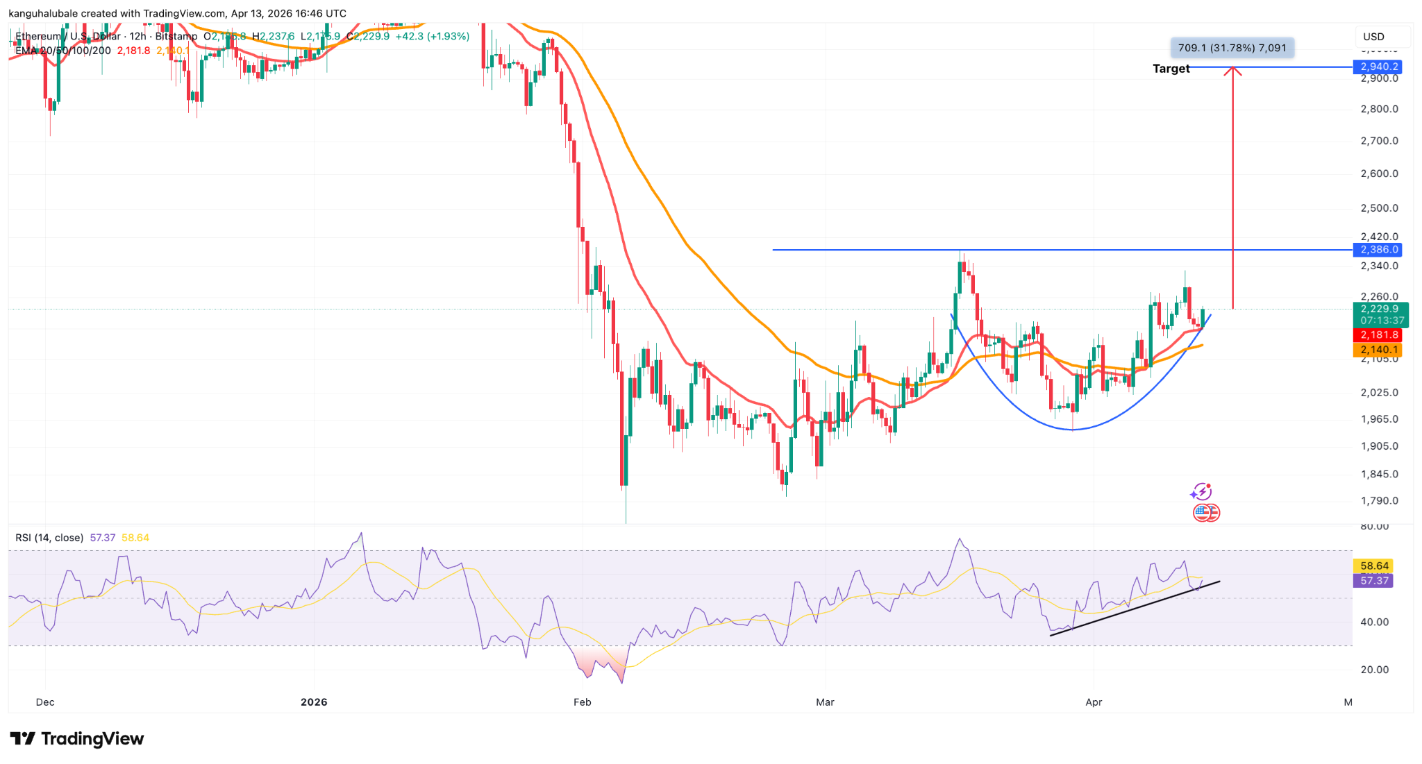 Ether’s price action has formed a rounded bottom chart pattern on the 12-hour chart. The price is retesting the $2,140 support, where the chart’s support line and the 20-day exponential moving average (EMA) converge.