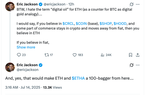 Jackson said his prediction doesn’t assume there will be any breakouts in decentralized finance, stablecoins, or higher use of Robinhood and Coinbase’s layer 2 networks, adding that the addition of those factors would make ETH “a 100-bagger.”