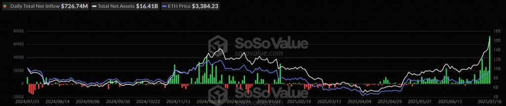 Spot Ethereum ETFs recorded their highest single-day inflows to date on July 16, with investors injecting a combined $726.74 million into nine US-listed funds.