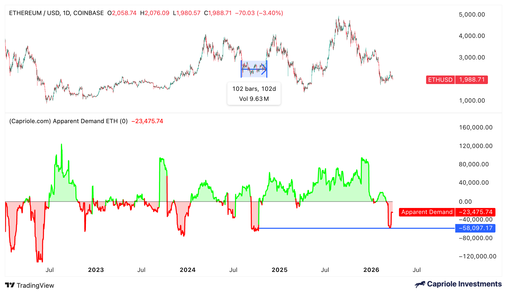 Capriole Investment’s Ethereum Apparent Demand metric shows that the demand for ETH has been negative since March 3, bottoming around -58,000 ETH on March 16, marking 16-month lows. The metric has since improved to -23,475 ETH at the time of writing.