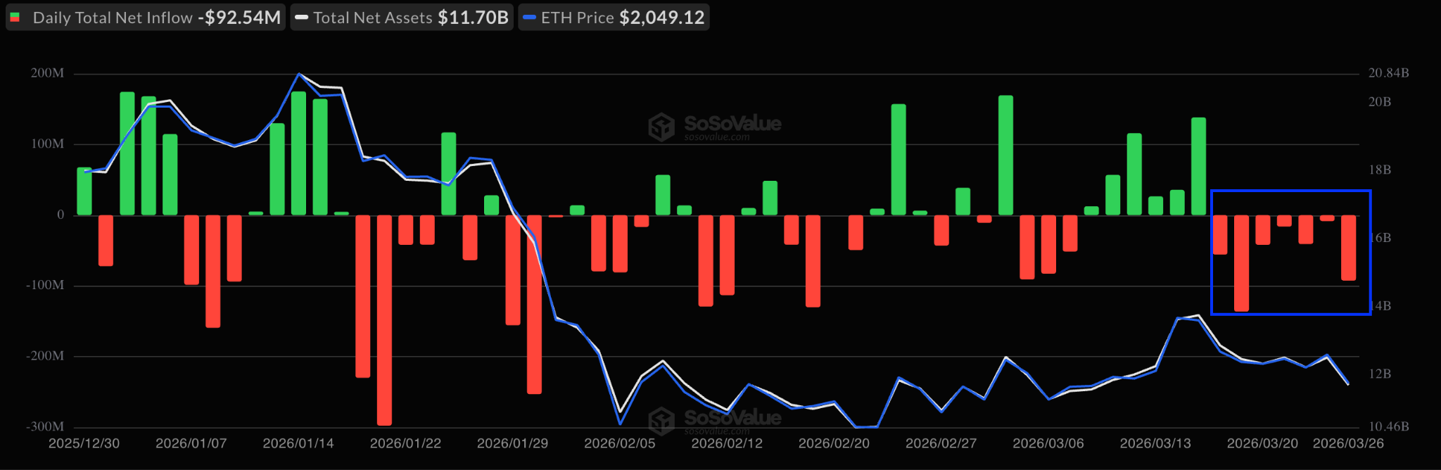 Global Ether exchange-traded products (ETPs) also recorded $27.2 million of outflows last week, reinforcing reduced appetite for ETH among institutional investors.