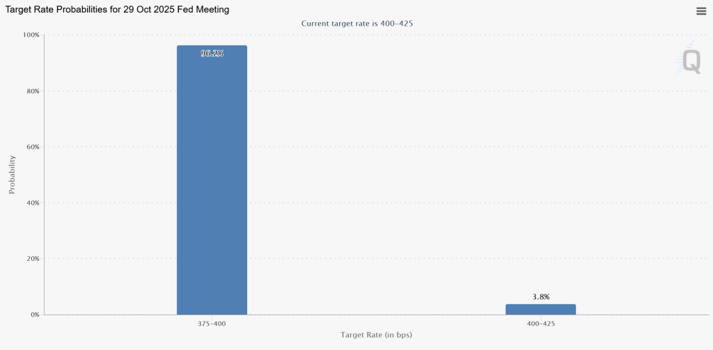 Still, markets remain confident that the Fed will proceed with further cuts. CME Group’s FedWatch Tool now assigns a 97% probability of a 25-basis-point cut in October, and an 85% chance of another reduction by December.