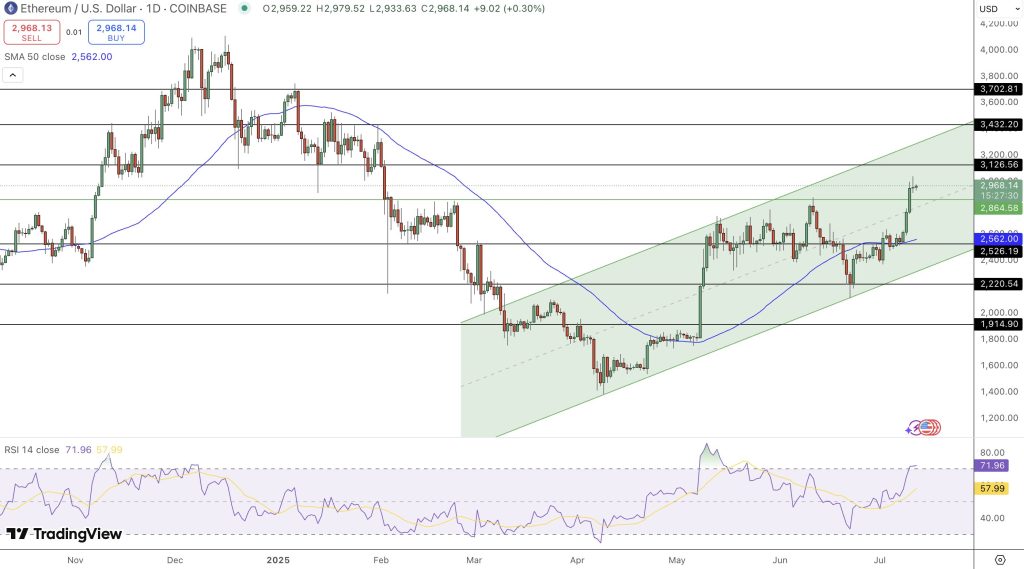 From a charting perspective, Ethereum price prediction seems bullish as it has broken out of an ascending channel since March. Daily RSI is at 72, indicating strong momentum but overbought conditions. No reversal candles yet, bulls are in control.