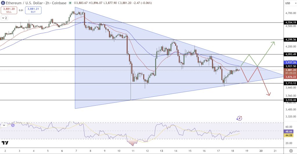 From a technical perspective, Ethereum price prediction remains neutral is consolidating within a symmetrical triangle, a pattern that often precedes sharp breakouts. The upper resistance lies near $3,937, aligning with the 100-EMA, while support sits around $3,713–$3,510, where the 50-EMA converges.