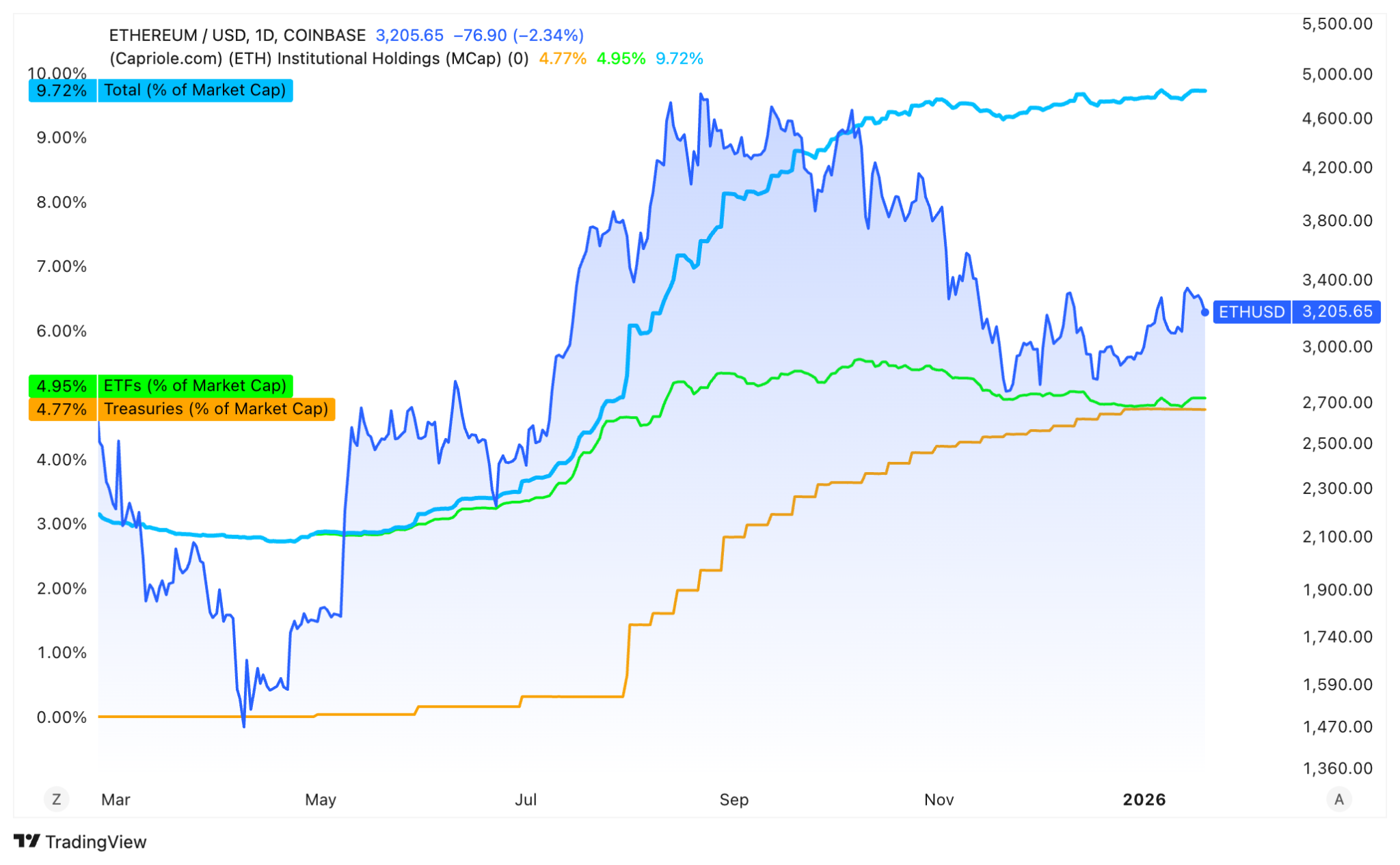 Data from Capriole Investments reveals that collective holdings of strategic reserves and ETFs have jumped by 10% since Nov. 22, 2025, climbing to 12,227,531 ETH from 11,594,738 ETH.