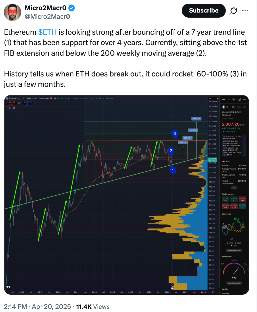 Zooming out, analyst Micro2Macr0 said that a breakout from a multi-year ascending triangle could lead to a 60%-%100% ETH price rally.