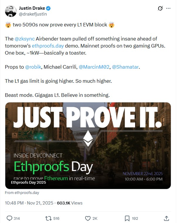 ZKsync’s Airbender team can prove Ethereum blocks using “basically, a toaster.” Source: Justin Drake