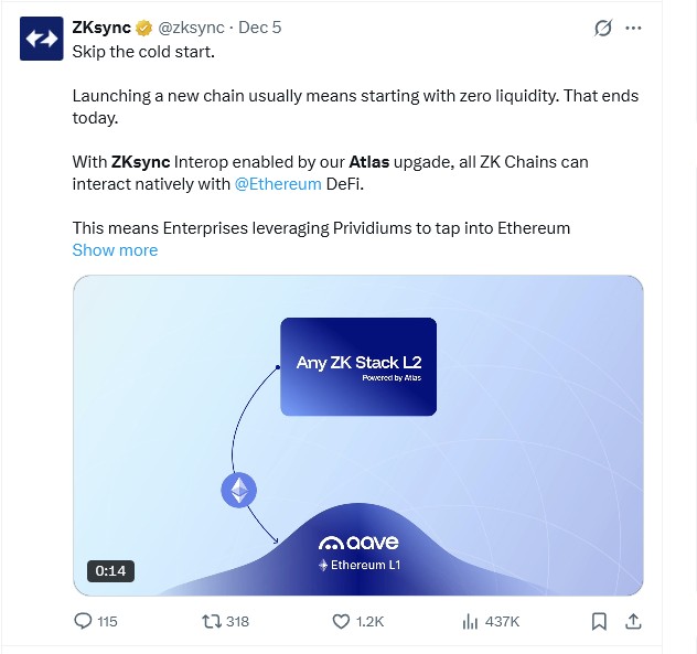 “Historically, every L2 had to bootstrap its own liquidity, spin up separate bridges, and rebuild the same DeFi stack, which is capital-inefficient and risky. With Atlas and Gateway, ZKsync chains can tap Ethereum’s liquidity directly in near real time, instead of fragmenting it across isolated pools. L2↔L2 transactions are ~1 second, and L1↔L2 transfers now finalize faster than a single Ethereum block.”