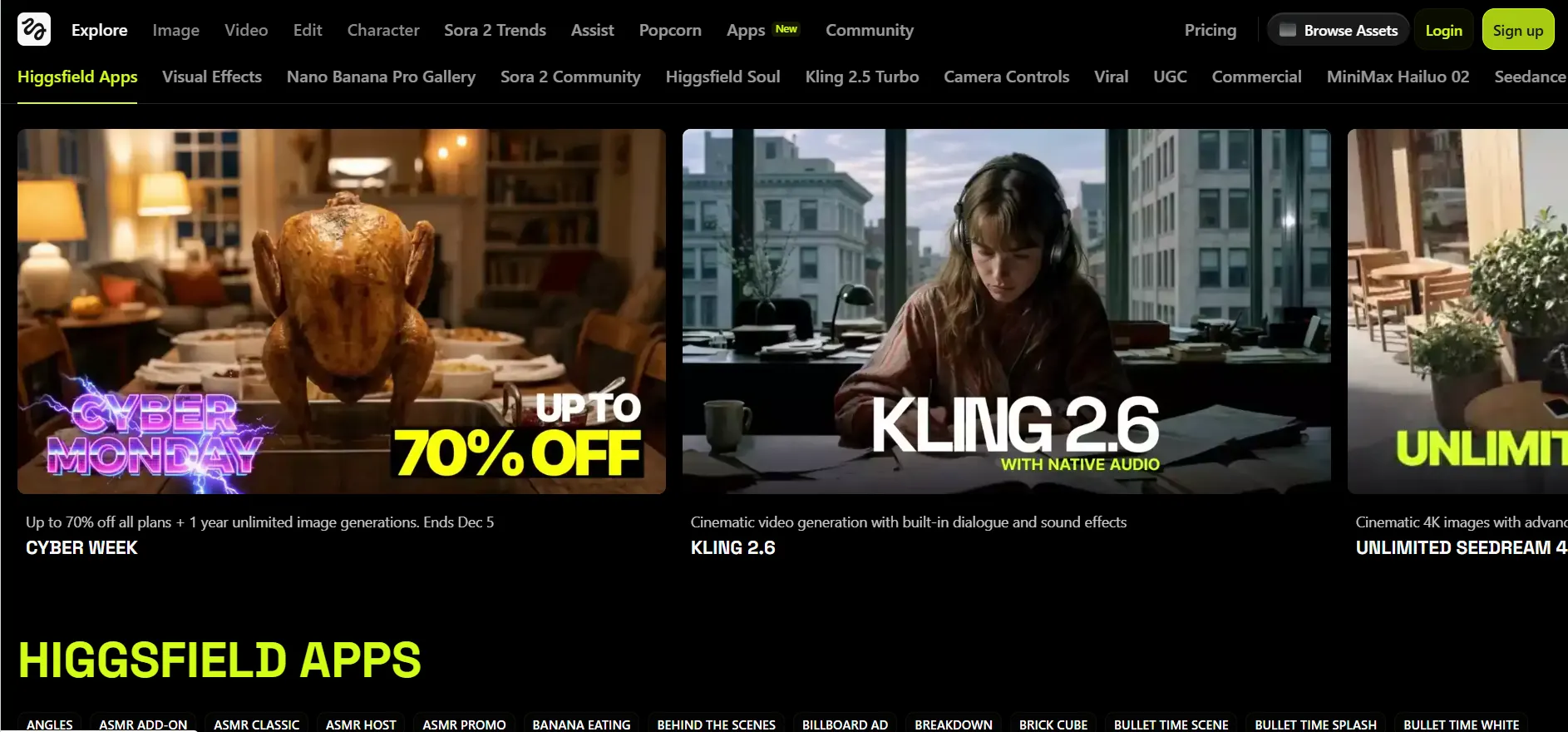 Higgsfield specializes in cinematic video generation with professional camera control. Over 50 AI-crafted camera movements—dolly zooms, crane shots, FPV-style paths—transform static images into dynamic clips in under two minutes.