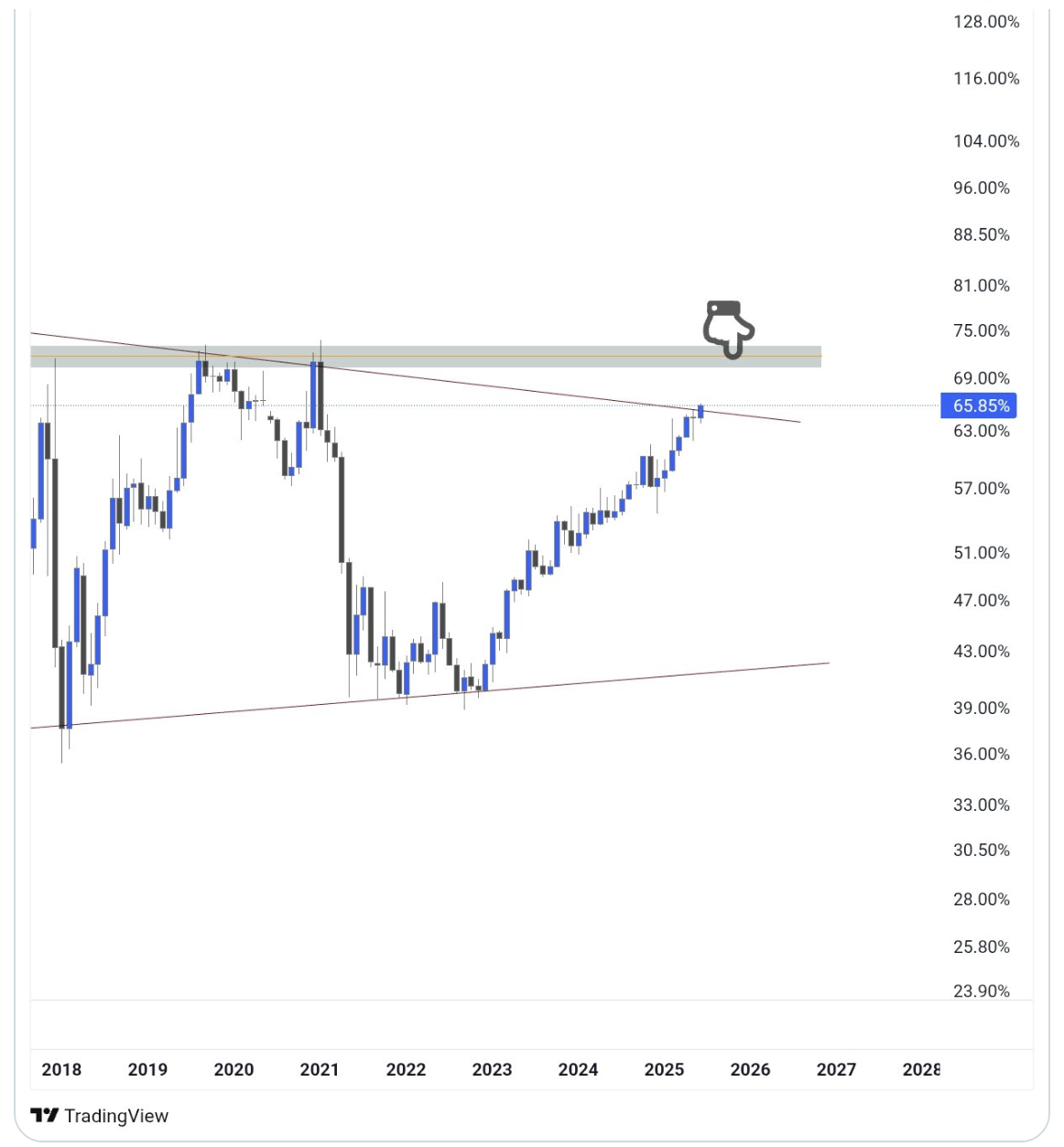 Historically, a “full-blown altseason” comes once Bitcoin dominance hits areas above 70% and then drops significantly, as highlighted by Mikybull Crypto.