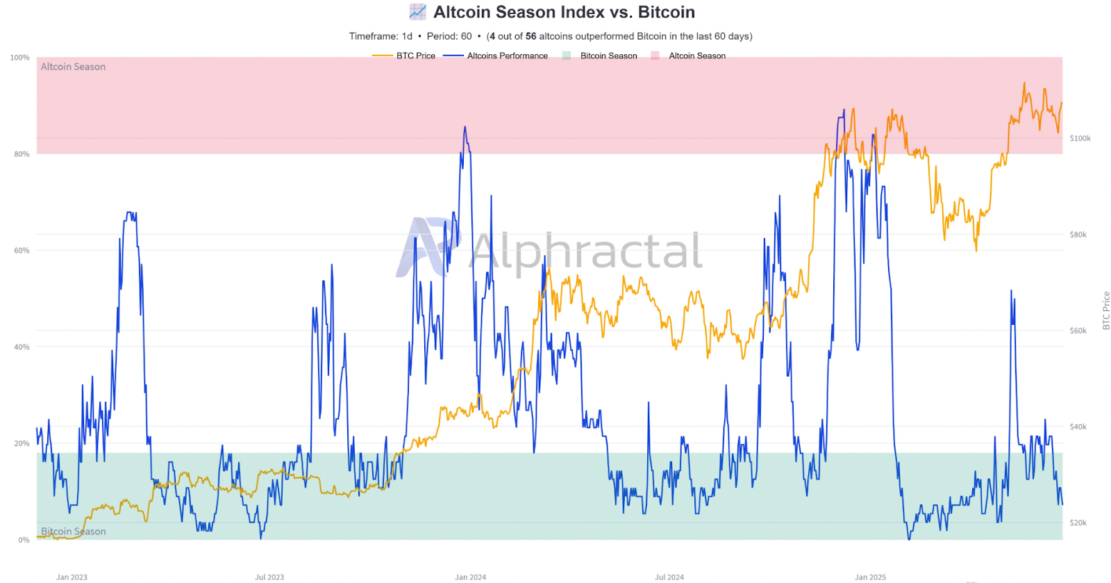 Bitcoin has outperformed altcoins over the last 60 days, with the altcoin season index in the green zone below 20%.