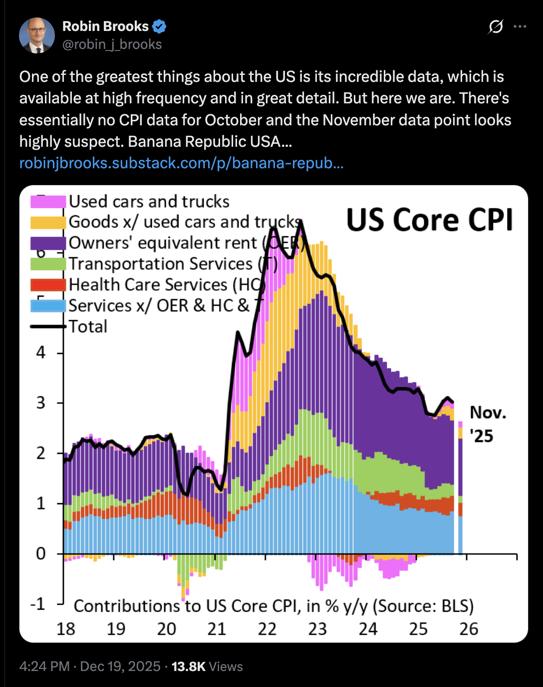 Still, the record US government shutdown disrupted the Bureau of Labor Statistics’ data collection. Some economists, including Robin Brooks, feared that it may have potentially distorted November’s annual inflation readings.