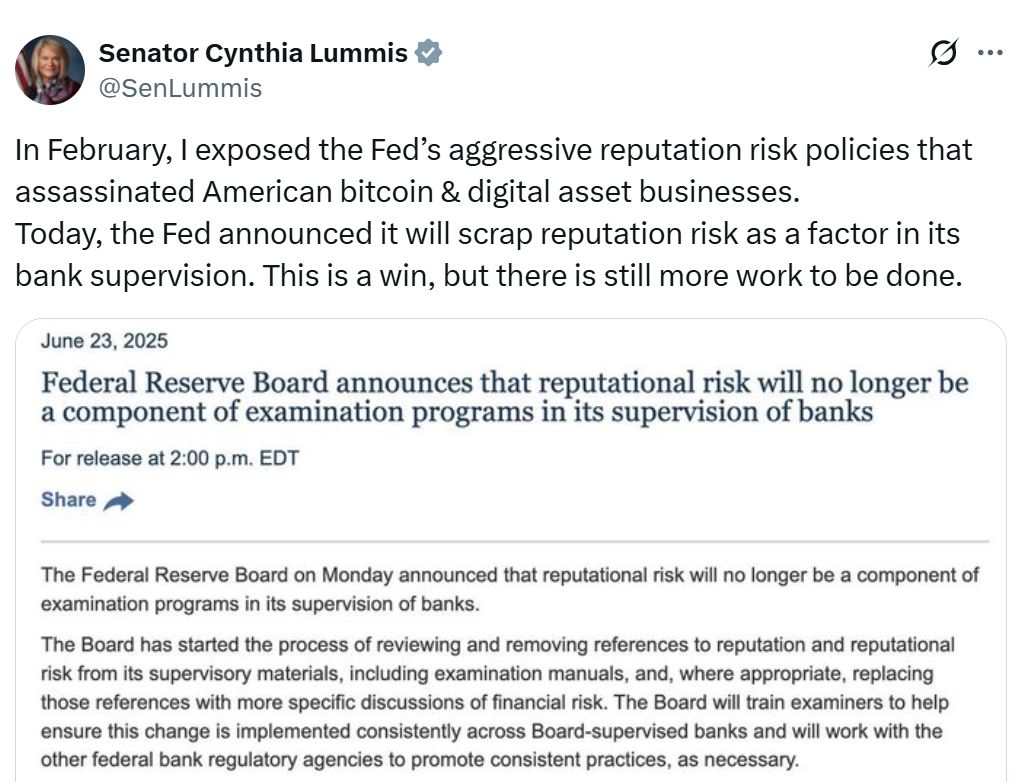 US Senator Cynthia Lummis said the aggressive reputation risk policies “assassinated American Bitcoin & digital asset businesses,” adding that “This is a win, but there is still more work to be done.”