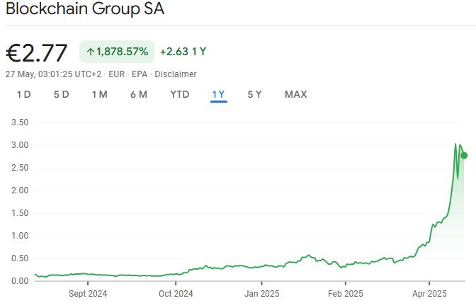 The Blockchain Group’s stock price has made significant gains since the company announced its Bitcoin buying plan. Source: Google Finance