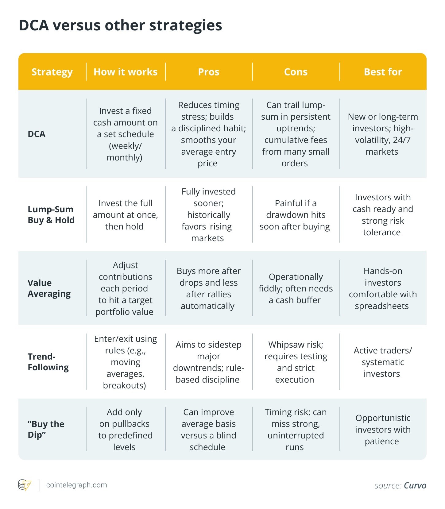 Crypto trades 24/7, with sharp moves as likely on a Sunday night as on a Tuesday morning. In such a continuous market, trying to “pick your moment” is mostly guesswork, which is why many investors prefer a rule that removes the need for perfect timing.