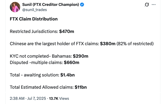 According to FTX creditor Sunil Kavuri, there is still $1.4 billion of FTX claims pending resolution, with $380 million coming from China and $660 million in disputed claims.