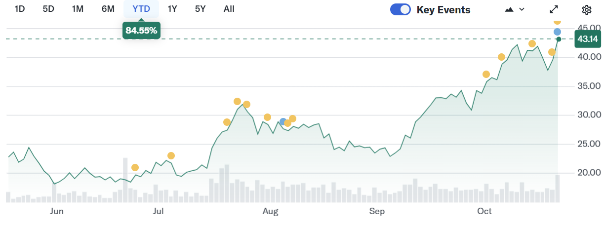Galaxy Digital shares jumped on the earnings news, climbing nearly 16% at one point before settling higher midday. The stock last traded above $43, up about 9% on the day.