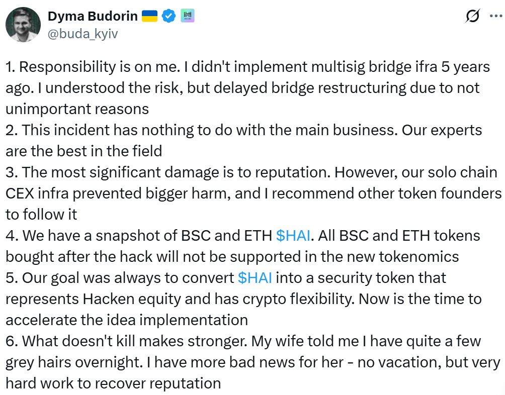 Hacken CEO Dyma Budorin said in an X post on Sunday that all tokens on the affected networks, BNB Smart Chain and Ethereum, bought after the hack “will not be supported in the new tokenomics.”